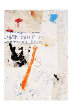 Casual red boots and fine splashes of paint are interlocked with a soft yellow field or the solid silence of a wrapping paper surface; forms of plants and tears from the newspaper, sharply outlined and unrecognizable figures interpenetrate each other. The whole is made up of countless large and small elements, bulky and unconventional pushing in all directions without falling out of order. Everything is connected and glued to everything, a moving realm of infinite possibilities and related opposites full of questions and poetry.